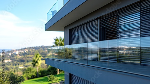 Naklejka premium Modern architectural design featuring a sleek balcony and scenic hillside view.