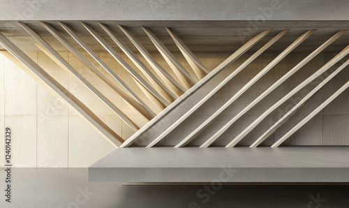 © JuanM, Naklejka premium Modern architectural design featuring dynamic wooden slats and textured concrete wall