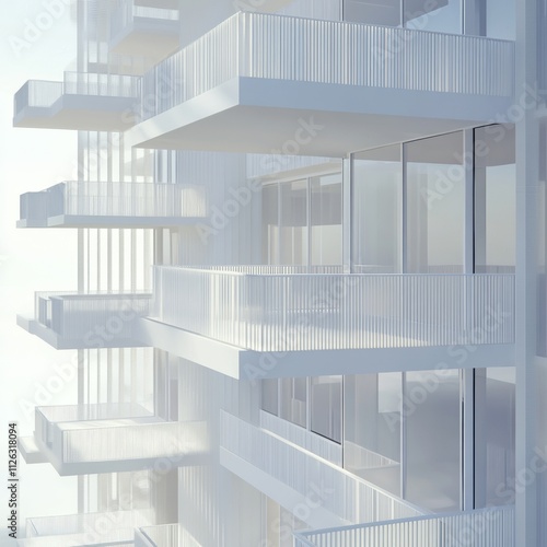 Fototapeta premium Modern architectural design featuring sleek, white balconies and a minimalist...