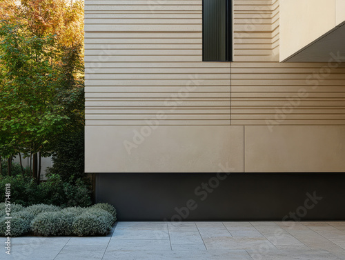 Fototapeta premium Modern architectural design featuring textured walls and landscaping in...