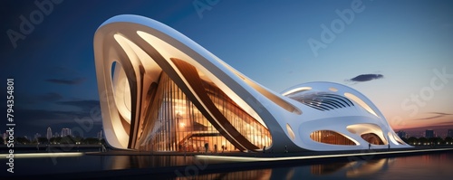 Obraz premium modern architectural design of a curvy, futuristic building illuminated at twilight