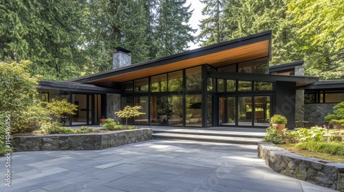 Fototapeta premium Modern architectural design of a house surrounded by lush green trees