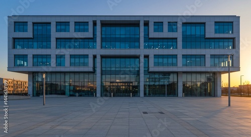 © Paul Studio, Obraz premium Modern Architectural Design Sleek Concrete and Glass Office Building at Sunrise