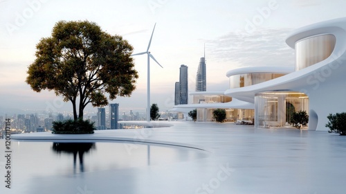 © Tana Studio, Obraz premium Modern architectural design with green technology in urban landscape at sunrise