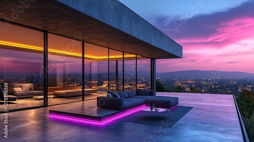 © generative ai image , Obraz premium Modern architectural home with a stunning infinity pool overlooking a serene sunset landscape.