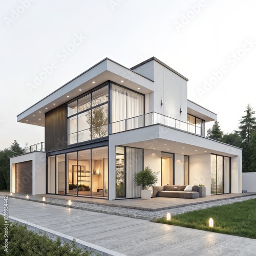 Naklejka premium Modern Architectural House Luxe Exterior Render, Floor-to-Ceiling Windows,...