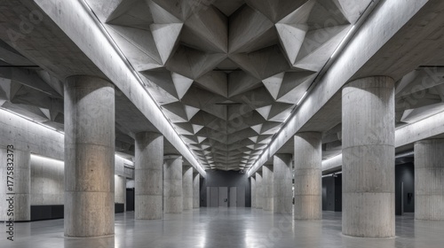 Fototapeta premium Modern Architectural Interior with Geometric Ceiling Design and Concrete Pillars in a Minimalist Style