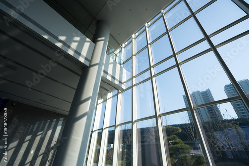 Naklejka premium Modern architectural interior with glass curtain wall allowing natural...