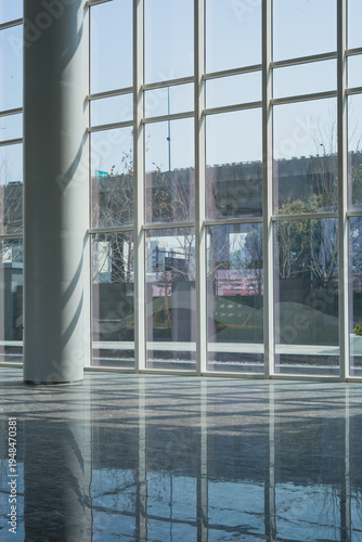 Obraz premium Modern architectural interior with glass curtain wall and natural light reflections on polished floor