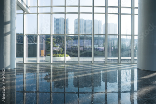 © zhu difeng, Obraz premium Modern architectural interior with glass curtain wall reflecting light and shadows on polished marble floor