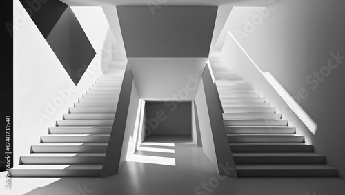 © Hosain, Fototapeta premium Modern Architectural Interior with Symmetrical Staircases and Minimalist Design