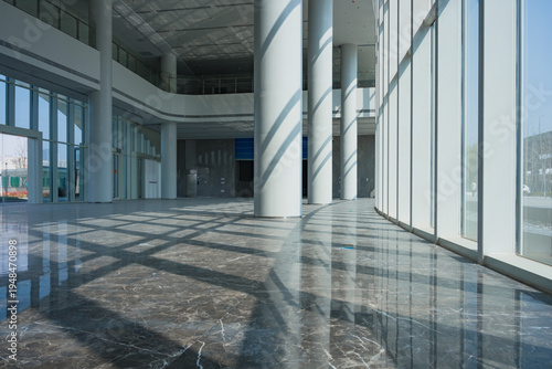 © zhu difeng, Fototapeta premium Modern architectural lobby with marble floor, columned arcade, and dramatic light shadows