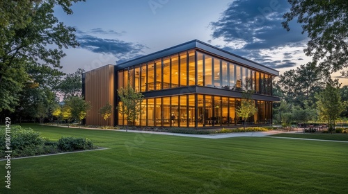 Fototapeta premium Modern architectural marvel showcasing a sleek glass and metal design, surrounded by lush greenery and illuminated by warm evening light.