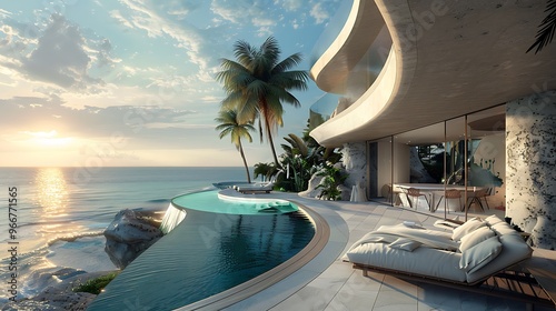 Fototapeta premium Modern architectural masterpiece perched on a cliff overlooking the ocean, featuring a sleek infinity pool and luxurious outdoor living spaces.