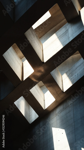 © Javier, Obraz premium Modern architectural space with tall concrete columns and soft lighting.