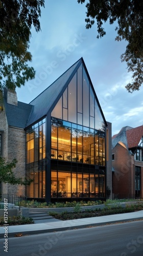 © Ari, Fototapeta premium Modern architectural structure featuring large windows and visible interior lighting