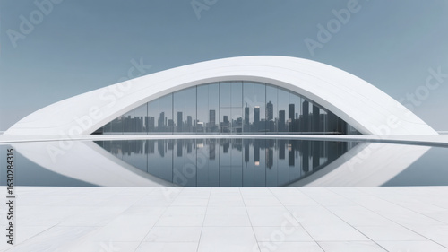 © meng, Obraz premium Modern Architectural Structure with Curved Design and Cityscape Reflection