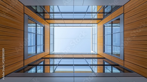 © Ariff Syahmi, Fototapeta premium Modern Architectural View from Below with Glass and Wood Elements