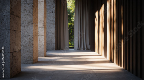 © Gun, Fototapeta premium Modern architectural walkway with vertical wooden louvers casting shadows in natural lighting through draped curtains and stone columns