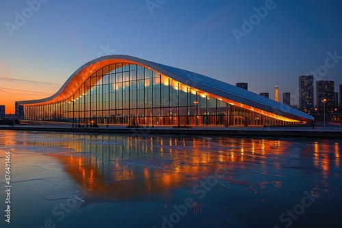 © Golib Tolibov, Obraz premium Modern Architecture at Dusk. Generative AI