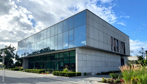 Fototapeta premium Modern Architecture Building with Glass Facade Against Blue Sky