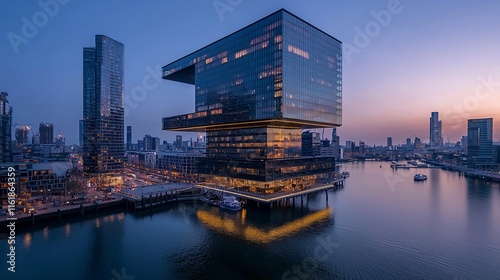 © Edi Purnomo, Fototapeta premium Modern architecture by waterfront at sunset.