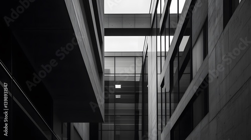 Fototapeta premium Modern architecture, concrete structures, geometric lines, building design, architectural photography, monochrome, black and white, urban design, contemporary architecture, building facade.