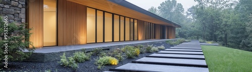 Fototapeta premium Modern architecture features large windows and a serene garden, creating a...