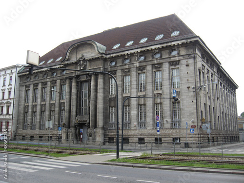 © alexmak, Naklejka premium Modern architecture in Lodz. Building with dark glass windows. Office building