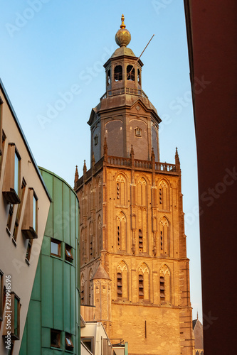 Naklejka premium Modern architecture of town hall in contrast with historic church tower of the Walburgiskerk in Zutphen. Historic old fortified town in the Netherlands