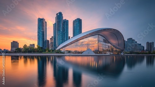 Fototapeta premium Modern architecture reflected in calm water at sunset.