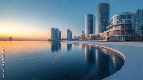Obraz premium Modern Architecture Reflecting in Calm Water at Sunset
