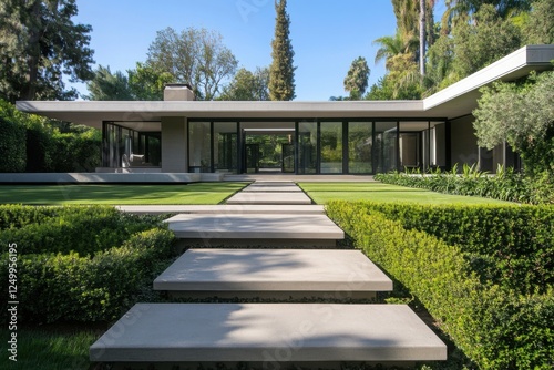 © gamespirit, Fototapeta premium Modern architecture showcased in a serene garden setting with a pathway leading to a stylish residence during bright daylight