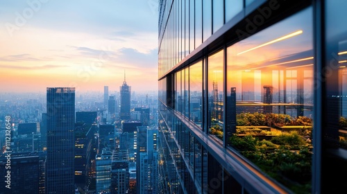 © Jiraporn, Obraz premium Modern architecture with a city skyline and green rooftop garden during sunset.