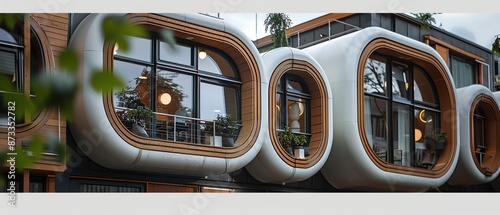 Obraz premium Modern architecture with rounded windows and wood accents.