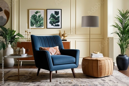 Fototapeta premium Modern Armchair Design in Chic Living Room Featuring Elegant Decor and Soft Cream Walls