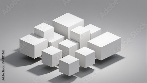 © Владимир Белобаба, Obraz premium Modern arrangement of geometric white cubes on a gray background