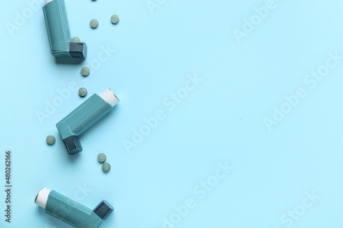 Naklejka premium Modern asthma inhalers and pills on blue background