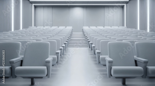 Fototapeta premium Modern auditorium with rows of gray seats and minimalist design, creating serene atmosphere for presentations or lectures. clean lines and neutral tones enhance focus and engagement