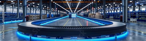 Fototapeta premium Modern automated warehouse interior, conveyor belts with smart technology and blue neon lights guiding the flow