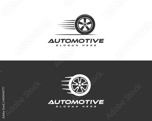 Obraz premium Modern automotive logo featuring a spinning wheel with motion blur and the word automotive