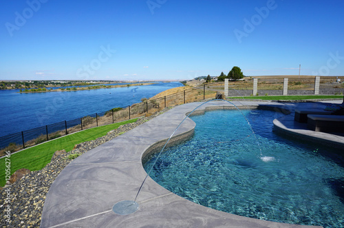 © jdoms, Fototapeta premium modern backyard swimming pool with view of river