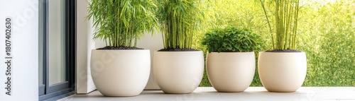 © Photo18@desing, Obraz premium Modern Balcony Decor Bamboo and Greenery in White Planters, outdoor plants, home decor