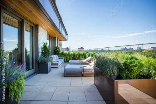© Baba Images, Obraz premium Modern balcony with plants and lounge chairs