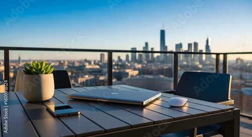Naklejka premium Modern Balcony Workspace with Laptop, Smartphone, Mouse, and Potted Succulent