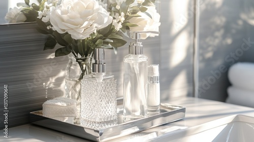 © Lesuna, Fototapeta premium Modern bathroom vanity with flowers and toiletries