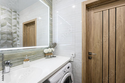 © evgeniykleymenov, Obraz premium Modern bathroom with a light-up mirror, white countertop, sink, a washing machine, and a wooden door