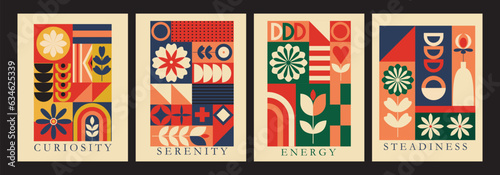 © IRYNA, Fototapeta premium Modern Bauhaus poster, banner, cover. Geometric abstract mural background. Geometric mosaic, shapes, flowers, rainbows. Retro vintage tiles and blocks.