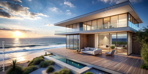 Fototapeta premium Modern beach house with stunning sea view, rendering, beach, living, sea view, ocean, view, modern, house, home, architecture