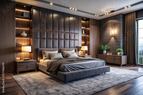 © Sandra, Fototapeta premium Modern bedroom design: dark brown bed, grey linens, 3D wall art, dark gray walls, built-in storage. 4K animation.
